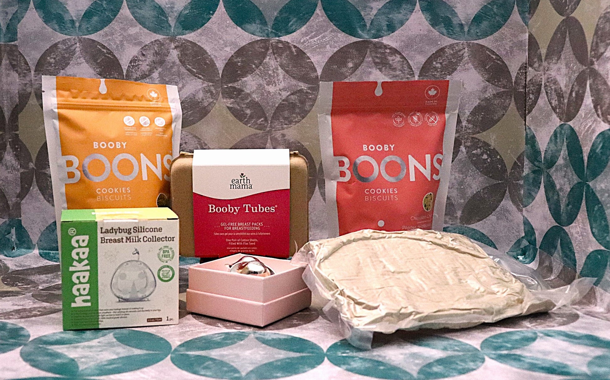 Inside the Boobie Kit Extra, you’ll find silver nipple shields, soothing therapy pads, two bags of delicious lactation cookies, a stylish breastfeeding cover, and an adorable ladybug Haakaas.